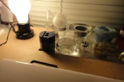 白熱灯電球、それを調光するルートロンの調光器、ステッドラーの鉛筆削り、LED電球、かなり昔日本板硝子からもらったガラスの置物、とても安かったイケアの蝋燭置き、小さなオイルランプ、結婚式でもらった蝋燭、メーカー不明の黄色い透明な鉛筆削り、MR16のランプ、赤いオレンジのアクリル円柱、手前はトレース台、その間に見えるのが六角レンチ.....。